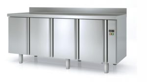 werkbanken gekoeld met dichte draaideuren , glasdeuren , indeling voor 40 x 60 cm , stekkerklaar of splitversie koelaggregaat, combinatie ook met spoelbakken en of werkbanken ongekoeld .